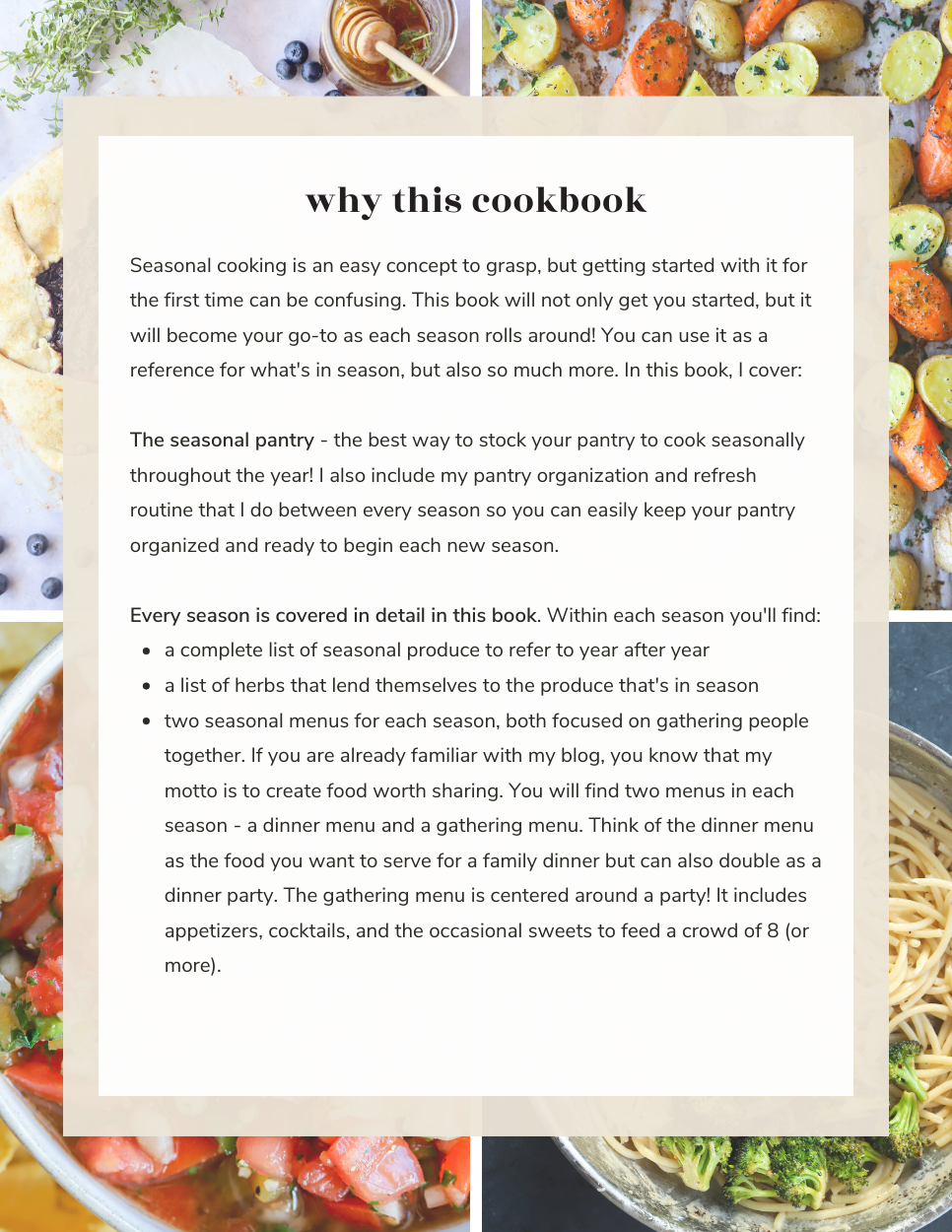 - The Seasonal Pantry - a chapter dedicated to how to stock your pantry year round to make the most of seasonal produce in your recipes! I also included an organization and refresh routine to refer to at the beginning of each new season.